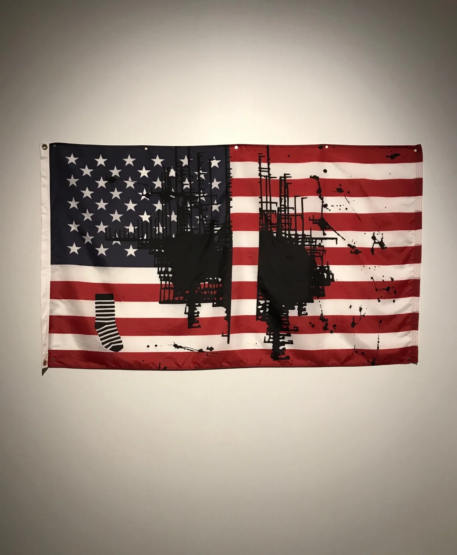 On the week of July 9th 2018, controversy befell the University of Kansas when word got out of a public art display that included a piece by German born artist Josephine Meckseper. The piece, titled “Untitled (Flag 2),” is the final piece of The Spencer Museum of Art and The KU Commons “Pledges of Allegiance” exhibition, a nation-wide public art project featuring 16 flags created renowned artists. Untitled (Flag 2) has the American flag as its backdrop, an abstract rendering of the U.S. split in two, and a sock in the left corner of black and white stripes. As with any work of art, one should ask: what do these symbols mean? Well, according to the informational panel next to the piece (now moved inside the museum), the split rendering of the U.S. is intended to symbolize the current disconnectedness or polarization of American society. Then, the sock, represents (again abstractly) the sort of superficial nature of our unity, while we form a country, we are nonetheless divided by these black and white lines. In essence, the piece is meant to taken as a call to awareness of our fractured country